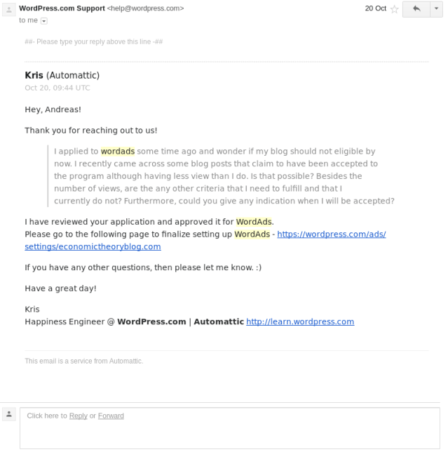 After sending the mail I was expecting a standardized reply forwarding me to the there FAQs. To my amazement, Kris, a happiness engineer @ wordpress, wrote back to me within a couple of hours. And Kris lived up to his job description, I got a positive answer. My blog was approved to the WordAds program with little over 15000 pageviews a month.