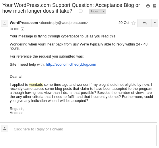 Some month earlier, I read some comments on the existence of blogs that were in the program and had allegedly 10000 views or less. So when reaching 15000 pageviews and still no news from WordAds I got impatient. I finally found the motivation to write WordAds directly. I got an immediate standardized message saying that they have received my mail.