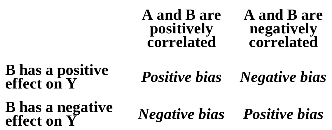 The illustration below summarizes the direction of the omitted variable bias. Let Y be the dependent variable, A and B the independent variables, and B the omitted variable.